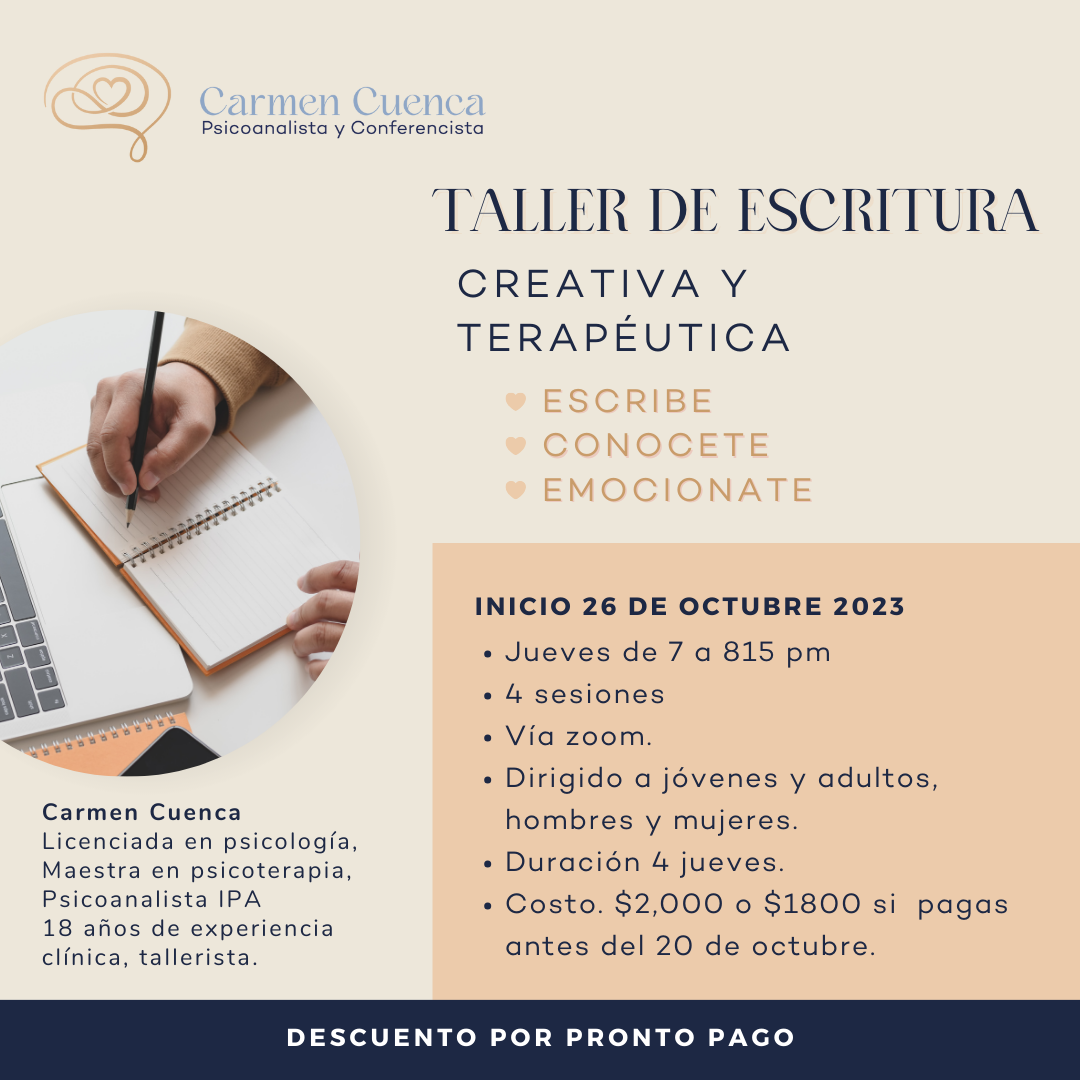 Si te gusta la escritura, o has tenido inquietud de empezar a poner en papel tus ideas y sentimientos. Si te gusta la literatura y hace tiempo que tienes ganas de entrar a terapia y no te animas.